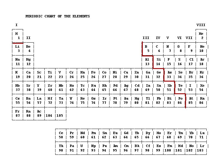 periodic chart of the elements metals & nonmetals families (groups) of elements alkali metals (group I) Li, Na, K, . . . alkaline earths (group II) Be, Mg, Ca, . . . halogens (group VII) F, Cl, Br, I, . . . noble gases (group VIII or 0) He, Ne, Ar, . . . group number = valence elec.