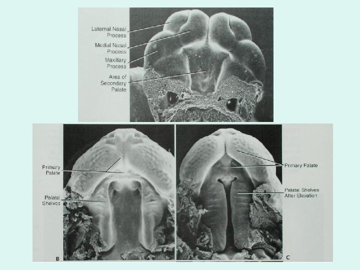 DEVELOPMENT OF THE PALATE The secondary palate – develops from two internal projections from the maxillary prominences, called the lateral palatine processes. These shelflike structures inicially project inferomedially on each side of the tongue. As the jaws develop, the tongue moves inferiorly and the lateral palatine processes gradually grow toward each other and fuse. They also fuse with the primary palate and nasal septum.