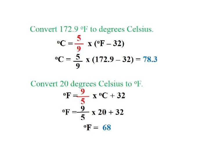 Example 1. 3: (a) Convert 224 0 C → 0 F? °F = [(9 /5 ) × °C ] + 32 [°F = (9 /5 ) × 224 °C] + 32 = 435 0 F (b) Convert -452 0 F → 0 C ? °C = (5 /9 ) (°F - 32 ) °C = (5 /9 ) (-452 - 32 ) = -269 0 C (c) Convert -38. 9 0 C → K ? ° K = -38. 9 °C + 273. 15 = 234. 3 K