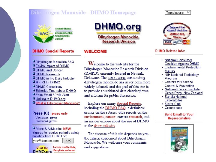 FAQ Dihydrogen Monoxide (DHMO) is a colorless and odorless chemical compound, also referred to by some as Dihydrogen Oxide, Hydrogen Hydroxide, Hydronium Hydroxide, or simply Hydric acid. Its basis is the highly reactive hydroxyl radical, a species shown to mutate DNA, denature proteins, disrupt cell membranes, and chemically alter critical neurotransmitters. The atomic components of DHMO are found in a number of caustic, explosive and poisonous compounds such as Sulfuric Acid, Nitroglycerine and Ethyl Alcohol.