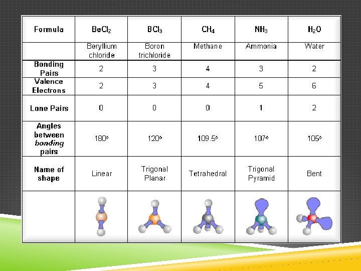 COMMON MOLECULAR SHAPES 4 total 4 bond 0 lone CH 4 TETRAHEDRAL 109. 5°