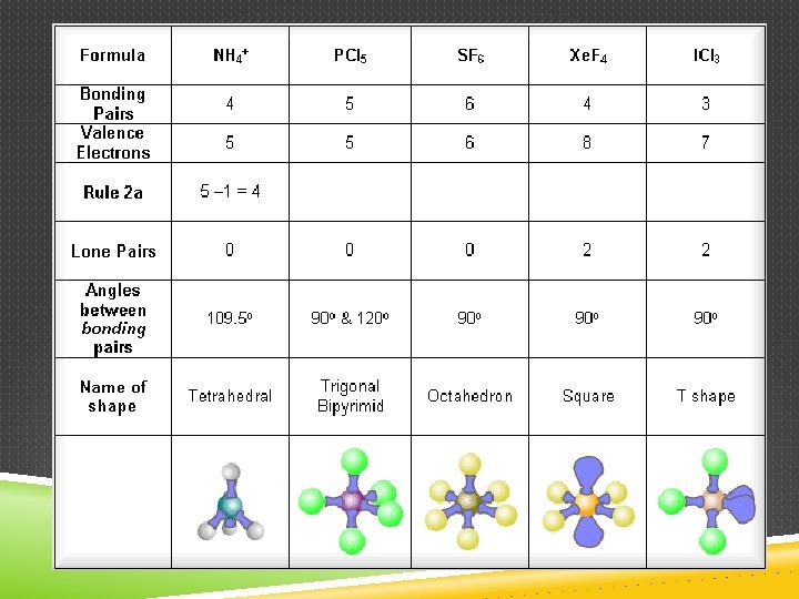 COMMON MOLECULAR SHAPES 6 total 6 bond 0 lone SF 6 OCTAHEDRAL 90°
