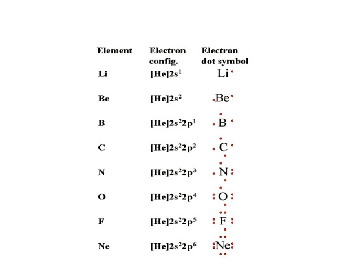 – S: [Ne]3 s 23 p 4 • The dots (representing electrons) are placed on the four sides of the atomic symbol (top, bottom, left, right) • Each side can accommodate up to 2 electrons • The number of valence electrons in the table below is the same as the column number of the element in the periodic table (for representative elements only)