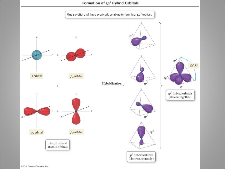 sp 3 Hybridization • Atom with four electron groups around it – tetrahedral geometry – 109. 5° angles between hybrid orbitals • Atom uses hybrid orbitals for all bonds and lone pairs