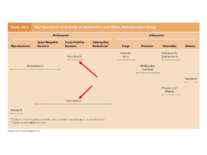 The Spectrum of Antimicrobial Activity • = range of organisms affected by a drug Broad • _______ spectrum antibacterial drug affects both gram + and gram – organisms Narrow • _______ spectrum drug affects one or the other • See table 20. 2
