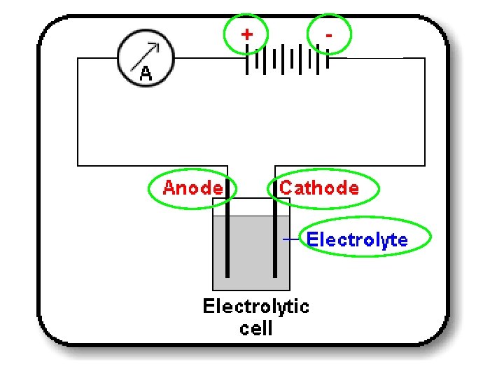 Terms to remember… • Electrolytes: – molten ionic compounds or aqueous solutions • Electrodes: metal plates or carbon rods used to conduct an electric current. – Anode: electrode connected to the positive terminal of the battery. – Cathode: electrode connected to the negative terminal of the battery. • Anion: negative ion that is attracted to the anode. • Cation: positive ion that is attracted to the cathode.