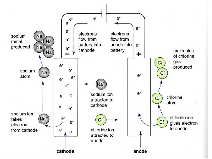 • Overall reaction: 2 Na. Cl (l) 2 Na (l) + Cl 2 (g) • Na+ ions are discharged at the cathode and Cl- ions are discharged at the anode.