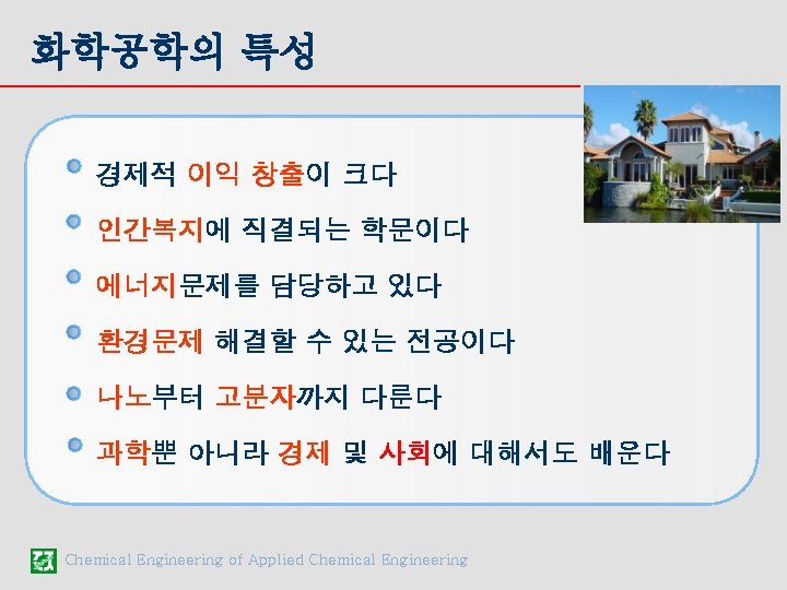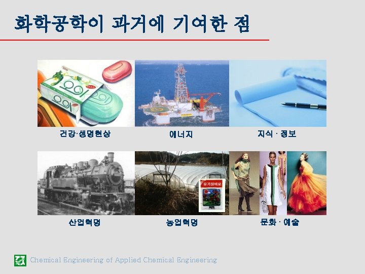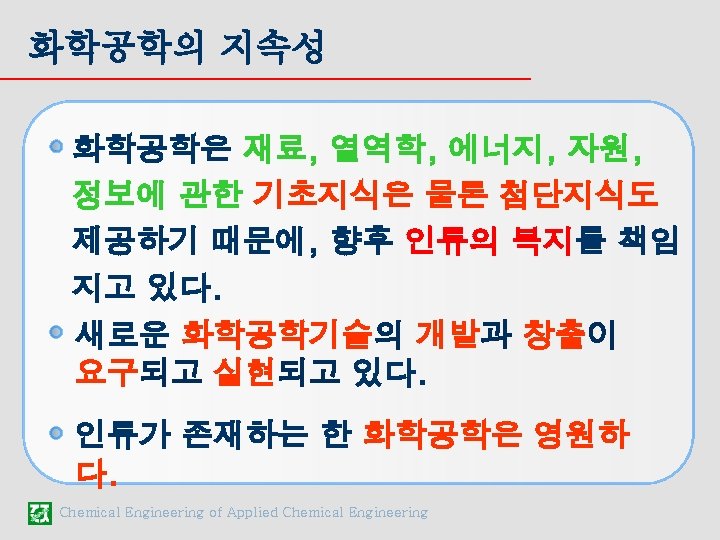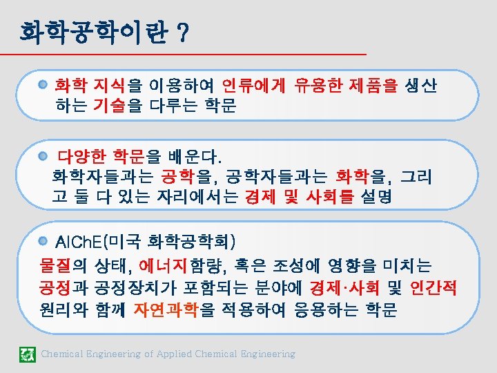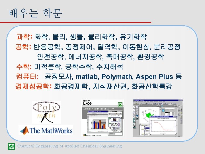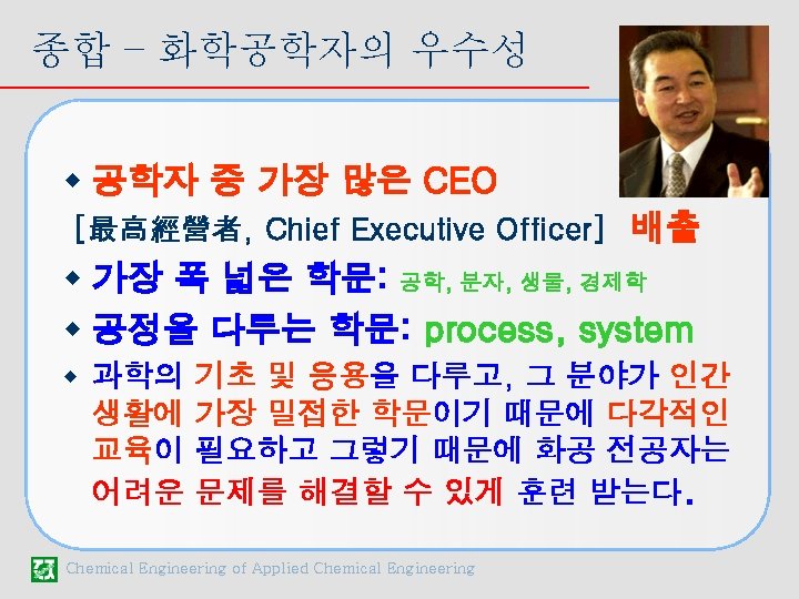 화학공학의 다양한 직업 n 기획, 설계공학자(Project & Design Engineer) n 생산 관리자(Production Manager) n 플랜트 엔지니어(Plant Engineer) n 연구 개발(Research and Development) n CEO (Chief Executive Officer) n 고급공무원 n 변리사 n 후속학문에 유리(로스쿨, 의학대학원) Chemical Engineering of Applied Chemical Engineering