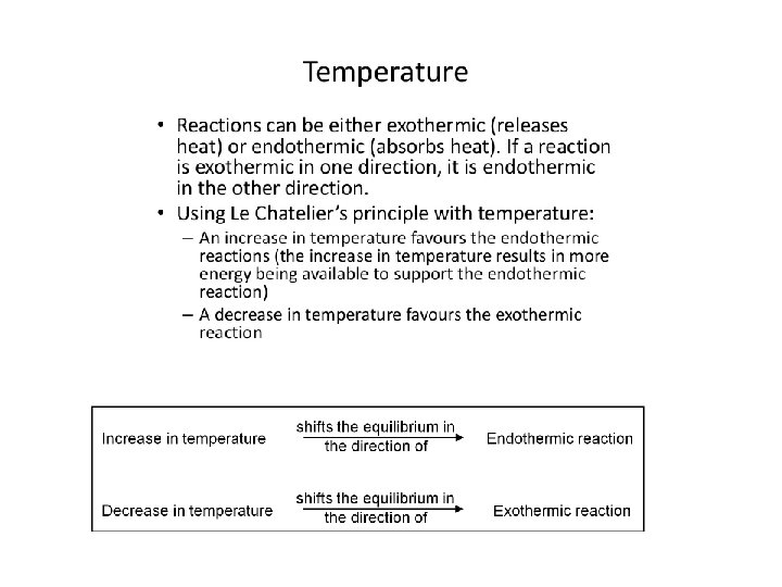 In Summary Stress Change Increase in concentration of X Reaction that removes X is favoured Decrease in concentration of X Reaction that forms X is favoured Increase in temperature Endothermic reaction is favoured Decrease in temperature Exothermic reaction is favoured Increase in Pressure Reaction that produces fewer molecules is favoured Decrease in Pressure Reaction that produces more molecules is favoured Adding a Catalyst No Change