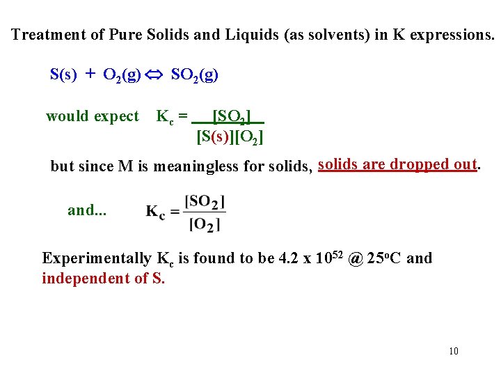 Treatment of Pure Solids and Liquids (as solvents) in K expressions. S(s) + O 2(g) SO 2(g) would expect Kc = [SO 2] [S(s)][O 2] but since M is meaningless for solids, solids are dropped out. and. . . Experimentally Kc is found to be 4. 2 x 1052 @ 25 o. C and independent of S. 10