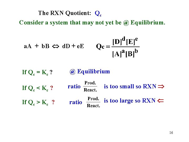 The RXN Quotient: Qc Consider a system that may not yet be @ Equilibrium. a. A + b. B d. D + e. E If Qc = Kc ? @ Equilibrium If Qc < Kc ? ratio is too small so RXN If Qc > Kc ? ratio is too large so RXN 16