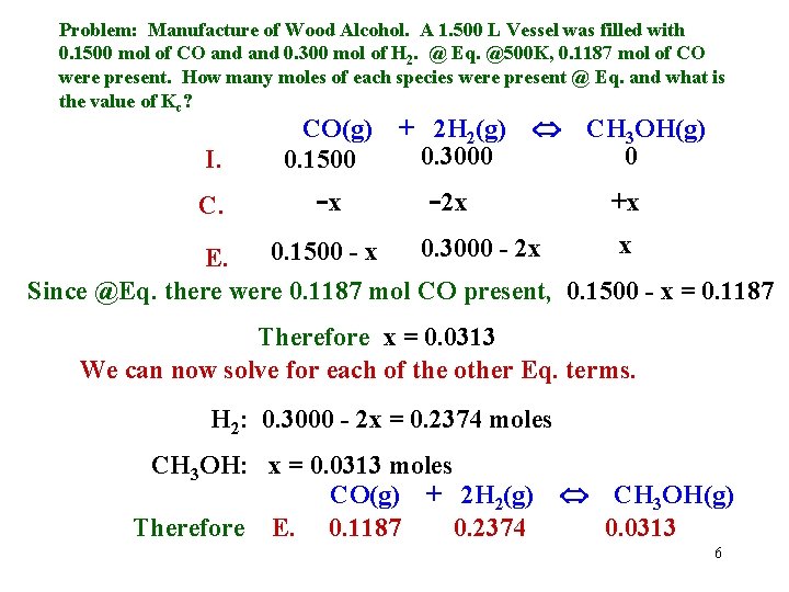 Using I. C. E. (Initial, Change, Equilibrium) Problem: Manufacture of Wood Alcohol. A 1. 500 L Vessel was filled with 0. 1500 mol of CO and 0. 300 mol of H 2. @ Eq. @500 K, 0. 1187 mol of CO were present. How many moles of each species were present @ Eq. and what is the value of Kc? CO(g) + 2 H 2(g) CH 3 OH(g) 0. 3000 0 I. 0. 1500 C. -x -2 x +x x 0. 3000 - 2 x 0. 1500 - x E. Since @Eq. there were 0. 1187 mol CO present, 0. 1500 - x = 0. 1187 Therefore x = 0. 0313 We can now solve for each of the other Eq. terms. 5