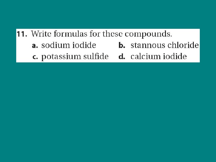 9. 5 : Naming Chemical Compounds • In writing a chemical formula from a chemical name, it is helpful to remember the following guidelines. – An -ide ending generally indicates a binary compound. – An -ite or -ate ending means a polyatomic ion that includes oxygen is in the formula.