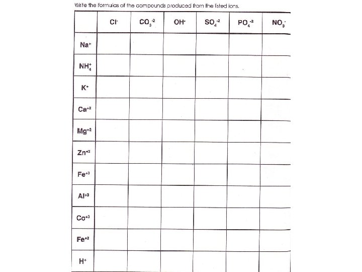 • • • Aluminum hydroxide Al+3 OHAl (OH)3 Strontium bromide Sr+2 Br Sr. Br 2 • • • Iron (III) chloride Fe+3 Cl. Fe. Cl 3 Copper (II) iodide Cu+2 I – Cu. I 2