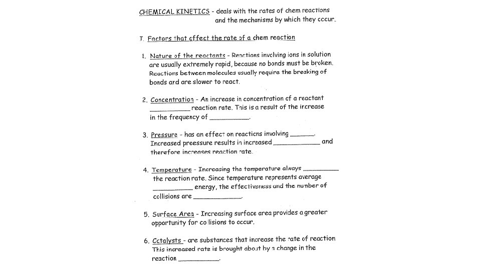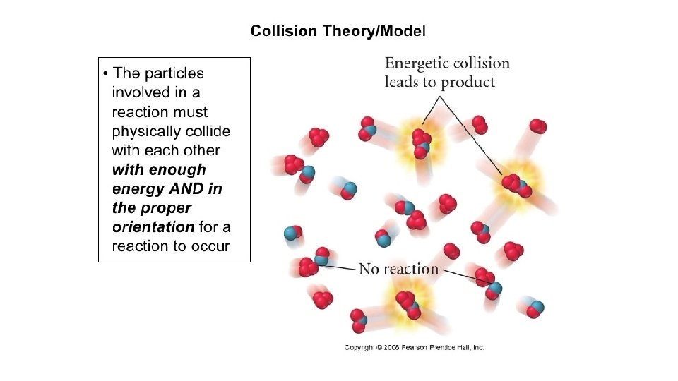 So what factor affect how elements react ? 1. Temperature - Temperature is measuring the Average Kinetic Energy of a material. Low Temperature = Elements moving at a slow speed with less kinetic energy High Temperature = Elements moving at a high speed with more kinetic energy So by heating a reaction up you increase the speed and energy of the collision of atoms. 2. Concentration – The more atoms there are in a container the great the chance they will collide and react. My analogy here is there is a better chance to have a car accident if you are driving fast in a crowded parking lot then driving slow in an empty one. 3. Orientation – The two elements must collide at just the right angle for the valance electrons to interact. Temperature and Concentration both affect this, as the atoms get hotter, their speed increases, and as there are more of them, there are more collisions and the odd increase that they will hit at the right angle to react more often.