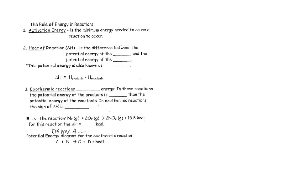 Potential Energy Diagrams There are two types of Energy Diagrams : 1. Exothermic - showing the release of energy – The react vessel will feel hot 1. Endothermic – Showing the absorption of energy – the reaction vessel will feel cold 1. The Heat of Reaction is the difference between the energy of the products minus the energy of the reactants. 1. The Heat of Reaction is Δ H An Exothermic reaction has a – ΔH and an Endothermic reaction has a + ΔH