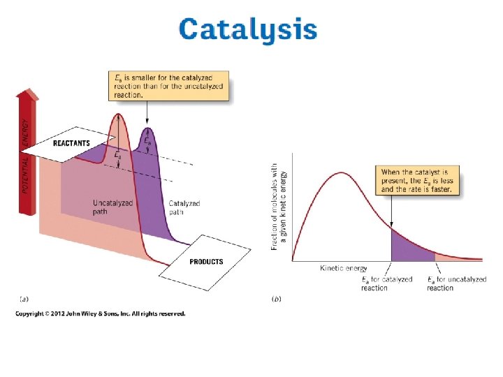 Catalyst • Substance that changes rate of chemical reaction without itself being used up • Speeds up reaction, but not consumed by reaction • Appears in mechanism, but not in overall reaction • Does not undergo permanent chemical change • Regenerated at end of reaction mechanism • May appear in rate law • May be heterogeneous or homogeneous