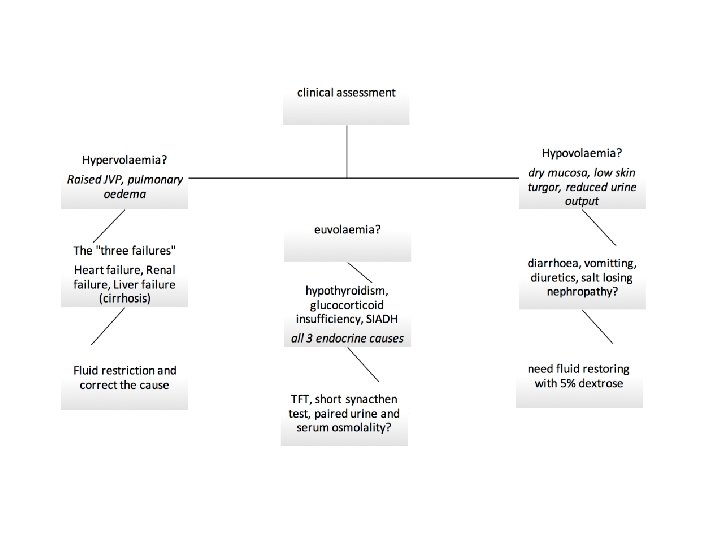 Treatment of hyponatraemia • Acute hyponatraemia can be symptomatic – – – Nausea and vomiting (< 134) Confusion (< 131) Seizures (< 125) Coma (< 117) In exceptional circumstances e. g. in a patient who is in status epilepticus secondary to hyponatraemia, hypertonic (3%) saline may be used on advise of a specialist and usually in ITU • Rapid correction can lead to central pontine myelinolysis (pseudobulbar palsy, paraparesis, locked-in syndrome) therefore aim to increase Na+ by no more than 8 -10 mmol per 24 h. • Note that chronic hyponatraemia may be asymptomatic even at low concentrations