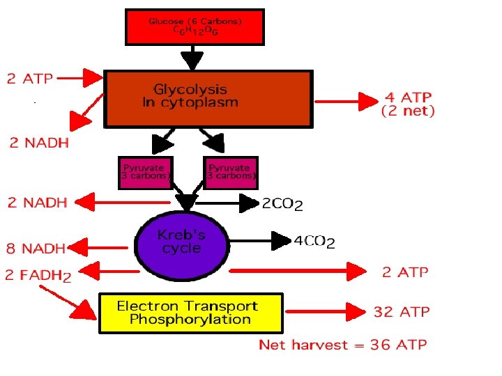 Glycolysis Takes place in the cytoplasm of the cell INPUTS: Glucose and 2 molecules of ATP OUTPUTS: 4 ATP (net gain of 2) and pyruvic acid NADH holds electrons for later use to create tons of energy Called an electron carrier