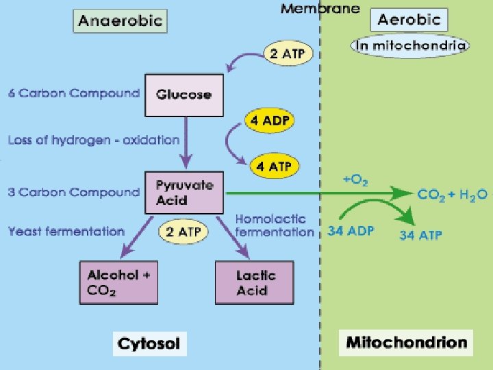 Fermentation If oxygen is not present, fermentation takes place after glycolysis Fermentation-releases ATP from food without the use of oxygen Two main types Alcoholic fermentation-yeast form ethyl alcohol and carbon dioxide as waste; cause bread dough to rise Lactic acid fermentation-lactic acid is produced Created when your muscles do not have enough oxygen to produce ATP when exercising o Buildup of lactic acid creates a painful burning sensation Unicellular organisms use to make food like yogurt, cheese, sour cream, pickles, sauerkraut