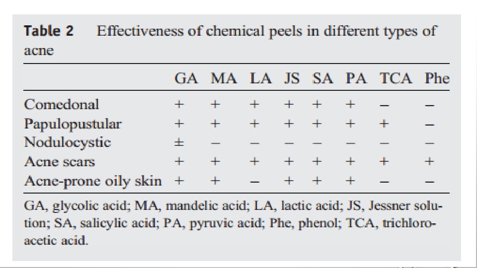 § SUPERFICIAL PEELS, INCLUDING 30% SA, 20 -70% GA, 92% LA, JS, AND 1025% TCA; ü (SUPERFICIAL PEELS ARE USED IN COMEDONAL AND PAPULOPUSTULAR ACNE) ü NOT INDICATED FOR NODULOCYSTIC ACNE. § MEDIUM-DEPTH PEELS, INCLUDING 40 -60% PA, 25 -50% TCA; § COMBINED PEELS, SUCH AS 25% SA + 25 -30% TCA, JS + 35% TCA, SMP, ARE RECOMMENDED FOR TREATING SUPERFICIAL ACNE SCARS. § DEEP PEELS : TCA AT CONCENTRATIONS OVER 40%, THE TCA CROSS