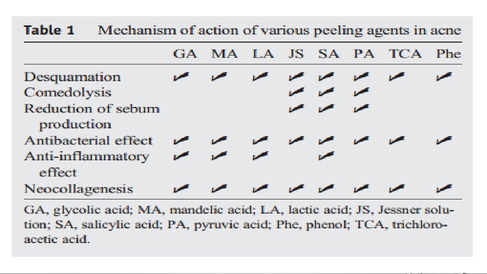 q. GA PEELS WERE COMPARED WITH SALICYLIC–MANDELIC ACID COMBINATION PEELS (SMPS) IN ACTIVE ACNE VULGARIS AND POST ACNE SCARRING. BOTH AGENTS WERE EFFECTIVE AND SAFE, WITH SMPS DEMONSTRATING HIGHER EFFICACY. q. COMBINATION OF MICRONEEDLING AND GA PEELS SIGNIFICANTLY IMPROVED ACNE SCARS. q. IN A COMPARATIVE STUDY, IN WHICH 70% GA AND JS WAS USED IN PATIENTS WITH ACNE, ü MORE EXFOLIATION WAS SEEN IN THE JS GROUP üALTHOUGH ACNE IMPROVED IN BOTH GROUPS TO THE SAME EXTENT.