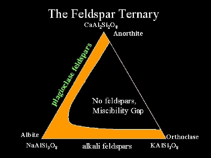 Melt-crystal equilibrium 2 miscibility monalbite anorthoclase 1100 Temperature (ºC) • 2 component mixing and separation chicken soup analogy, cools and separates • Fat and liquid can crystallize separately if cooled slowly • Miscibility Gap – no single mineral is stable in a composition range for x temperature high albite 900 700 500 sanidine intermediate albite orthoclase low albite microcline Miscibility Gap 300 10 Orthoclase KAl. Si 3 O 8 30 50 % Na. Al. Si 3 O 8 70 90 Albite Na. Al. Si 3 O 8