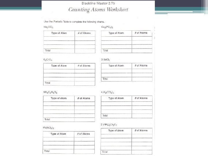 4. For each of the compounds in table 2, state the number of different elements present and the number of atoms of each element. What is the total number of atoms in each molecule? Sodium bicarbonate (baking soda): Na. HCO 3 1 sodium atom, 1 hydrogen atom, 1 carbon atom, 3 oxygen atoms Calcium carbonate (chalk): Ca. CO 3 1 calcium atom, 1 carbon atom, 3 oxygen atoms Sodium nitrate (fertilizer): Na. NO 3 1 sodium atom, 1 nitrogen atom, 3 oxygen atoms Calcium phosphate (fertilizer): Ca 3(PO 4)2 3 calcium atoms, 2 phosphorus atoms, 8 oxygen atoms Sodium chloride (salt): Na. Cl 1 sodium atom, 1 chlorine atom acetylsalicylic acid (ASA or aspirin): C 9 H 8 O 4 9 carbon atoms, 8 hydrogen atoms, 4 oxygen atoms Acetic acid (vinegar): C 2 H 4 O 2 2 carbon atoms, 4 hydrogen atoms, 2 oxygen atoms