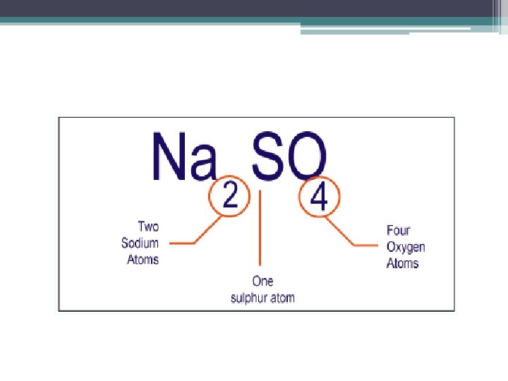 • Each chemical symbol in a formula represents an element. If only one element is present in a compound, no number is included. • If there is more than one atom of that element in the compound, the symbol is followed by a number written below the line. This number is called a subscript.