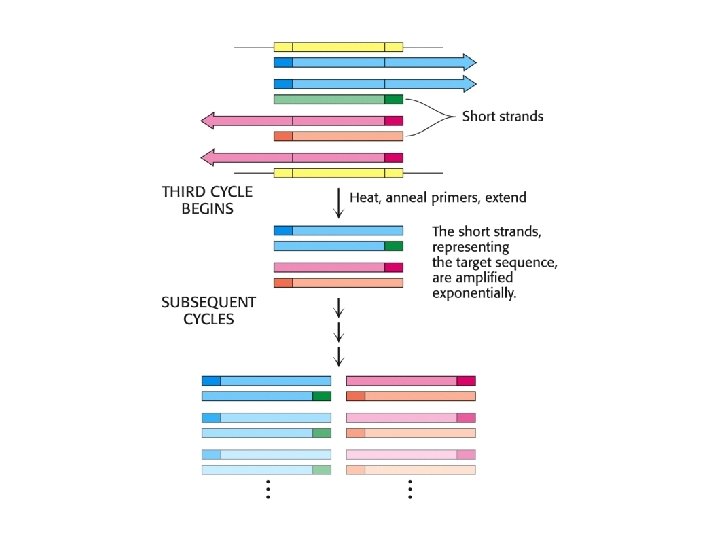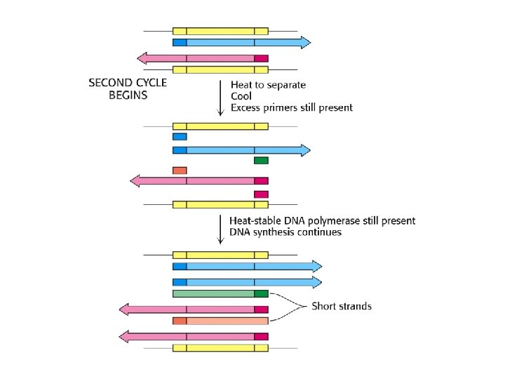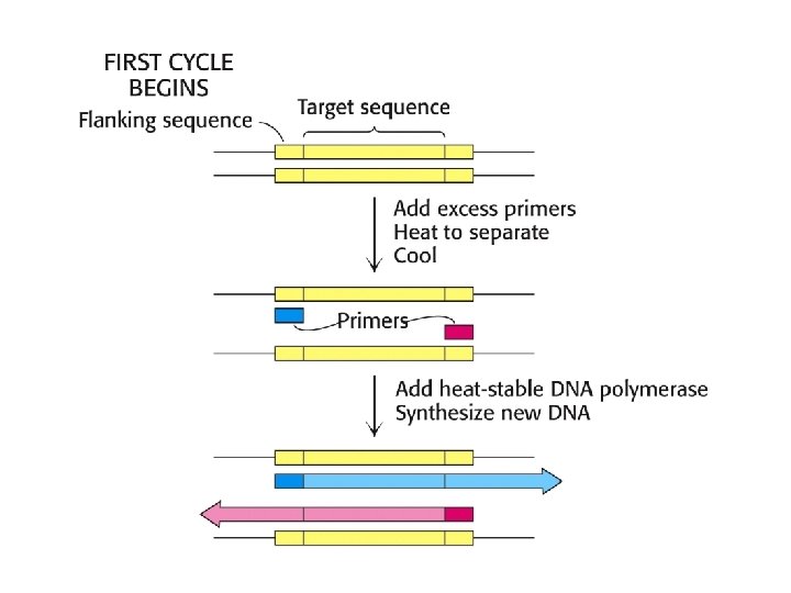 PCR (Polymerase Chain Reaction) 1. Add primers complementary to flanking sequence 2. Add all nucleoside triphosphates and thermostable DNA polymerase 3. Heat 95°C 15 s - strand separation 4. Cool 54°C – hybridization 5. Heat 72°C (optimal temp. ) – DNA synthesis