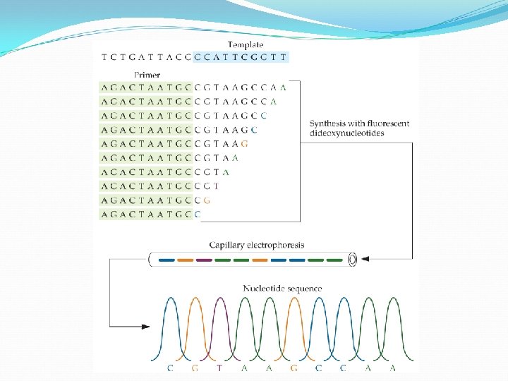 DNA Sequencing Electrophoresis separates strands by length Color of fluorescent tag indicates type of dd. NTP at end of the strand By checking end color of successive strand lengths, the sequence is revealed