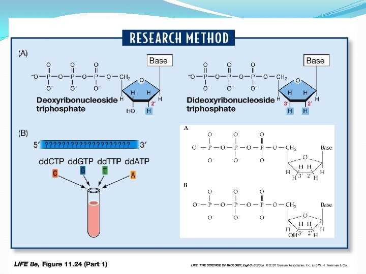 DNA Sequencing Single-stranded DNA is mixed with DNA polymerase, short primer strands, the four normal d. NTPs, and small amounts of fluorescently “tagged” dd. NTPs When a dd. NTP is encountered, growth stops Result is a solution containing different lengths of polynucleotides ending with tagged dd. NTPs at end