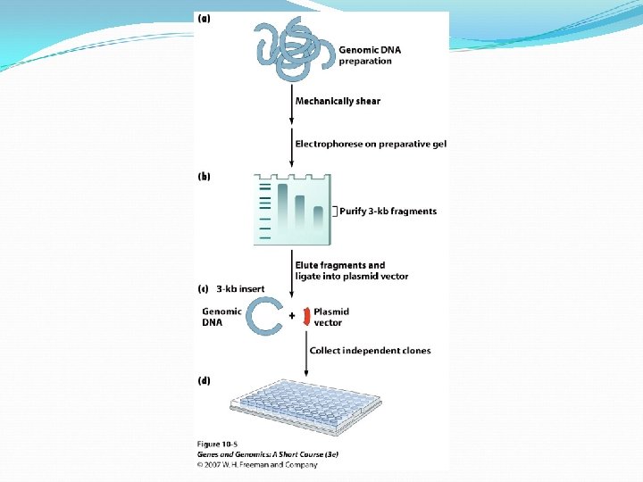 Shotgun cloning strategy Genomic DNA is isolated and randomly fragmented by sonication, nebulization, or hydrodynamic shearing. The frayed DNA fragments are repaired and phosphorelated. Fragments are separated into small, medium, and large fractions and cloned into plasmids and fosmids vector. After transformation of E. coli with the library, colonies with cloned DNA are picked and grown. Vectors DNA is purify from each library and sequenced.