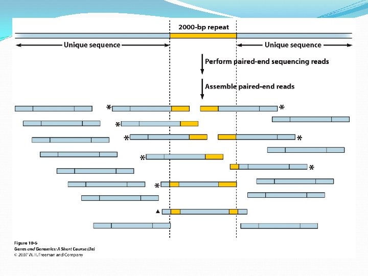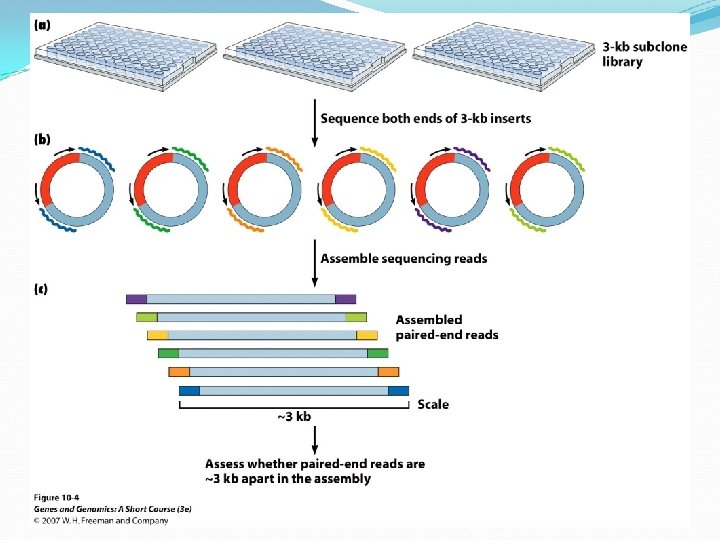 Paired-end Sequencing The subclone plasmid library must carry inserts that are approximately the same length, 3 kb. Both ends of the cloned insertion of each plasmid are sequenced in the shotgun-sequencing stage. When these reads are assembled, the computer check to see if any pairs of reads from the same plasmid appear in the assembly at places further or closer than about 3000 bp If so, this is an indication of an assembly error. Paired-end sequencing can helps sequence across repetitive regions.