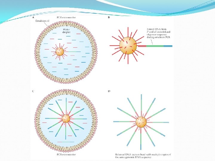 Emulsion PCR The beads and PCR reagents, including PCR primers that anneal to sequences that are part of adaptors A and B, are stirred vigorously with oil to create a waterin-oil emulsion “microreactor”. During PCR cycle, strands with the same sequences as the isolated A-DNA-B molecules are synthesized. Following the PCR, the emulsion is broken, the beads are collected, and all the free DNA molecules are washed away. Pyrosequencing is used to determine the nucleotide sequence. The flow signals from each well is captured and stored in computer.