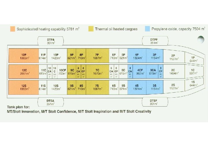 Chemical/product oil tankers Most of the world’s production of vegetable oils, commodity chemicals and refined petroleum products are transported on a large fleet of modern chemical/product tankers. Typically designed with coated cargo tanks, six to eight cargo segregations, no pump room, submerged ballast pumps, in-tank cargo pumps and deck mounted cargo heaters