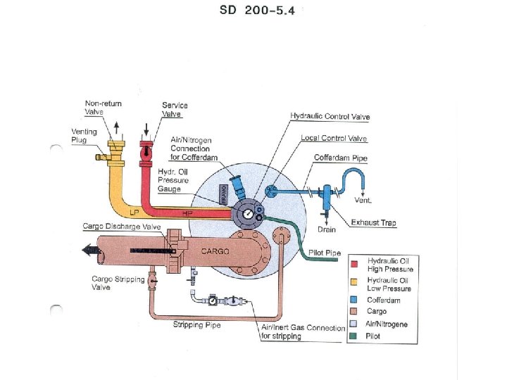 Cijev izlaza tereta iz linije tereta Stripping line Manometar Propuhivanje koferdama Cofferdam puging Propuhivanje linije tereta Main cargo line purging Cijev za regulaciju tlaka (broja okretaja pumpe) – spoj s kontrolnom kabinom Pipe for remote control – connected w. CCR