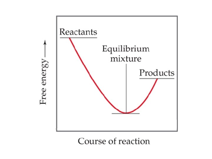 Free Energy and Equilibrium Under any conditions, standard or nonstandard, the free energy change can be found from the following relation: G = G + RT ln Q Where Q is the reaction quotient, representing the ratio of products to reactants concentrations (each raised to the power equals the number of moles in the balanced chemical equation) (Under standard conditions, all concentrations are 1 M, so Q = 1 and ln Q = 0; the last term drops out and we have: G = G ).