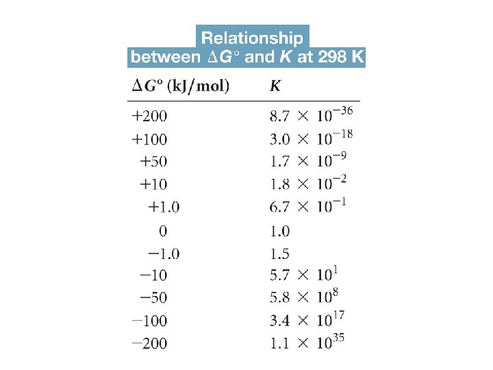 Free Energy and Equilibrium Constant G = G + RT ln Q At equilibrium, Q = K, and G = 0. The equation becomes 0 = G + RT ln K Rearranging, this becomes G = RT ln K or G /RT K = e