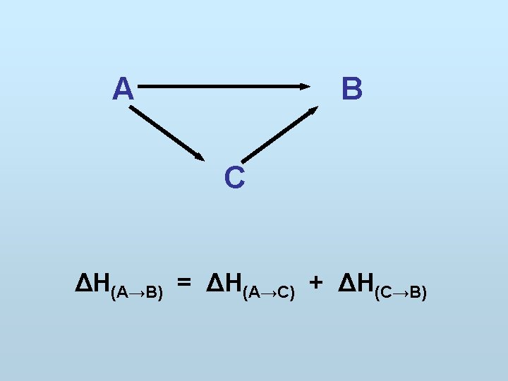 I. termochemický zákon Reakční teplo dané reakce a reakční teplo téže reakce, probíhající za stejných podmínek opačným směrem, je až na znaménko stejné: ΔH(A→B) = - ΔH(B→A)