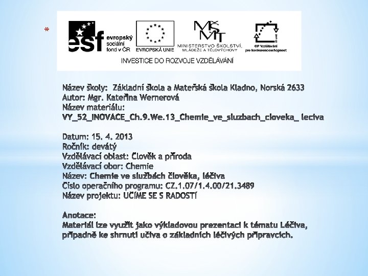 *Použité odkazy: *http: //cs. wikipedia. org/wiki/Penicilin#mediaviewer/ Soubor: Penicillin-core. png *http: //cs. wikipedia. org/wiki/Penicilin#mediaviewer/ Soubor: Penicillin. PSAedit. jpg *http: //cs. wikipedia. org/wiki/Antibiotika#mediaviewe r/Soubor: Alexander-fleming. jpg *http: //cs. wikipedia. org/wiki/Ibuprofen#mediaviewer /Soubor: Ibalgin. JPG *http: //cs. wikipedia. org/wiki/Ibuprofen#mediaviewer /Soubor: Ibuprofen-Enantiomere_Strukturformeln. png *http: //cs. wikipedia. org/wiki/Acylpyrin#mediaviewer/ Soubor: Aspirin-skeletal. svg *http: //cs. wikipedia. org/wiki/Acylpyrin#mediaviewer/ Soubor: Acylpyrin. jpg