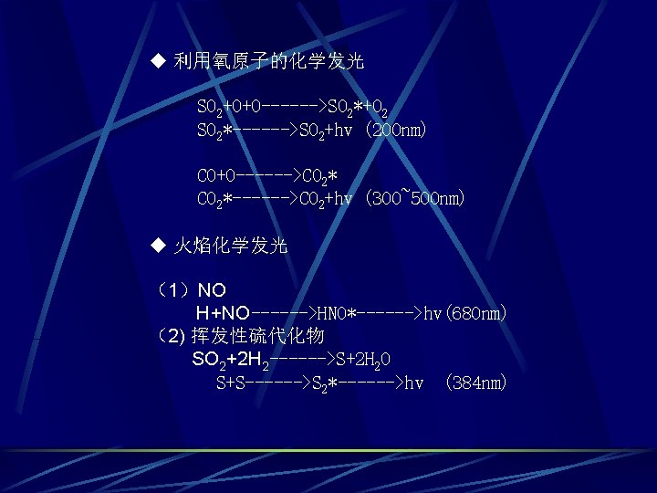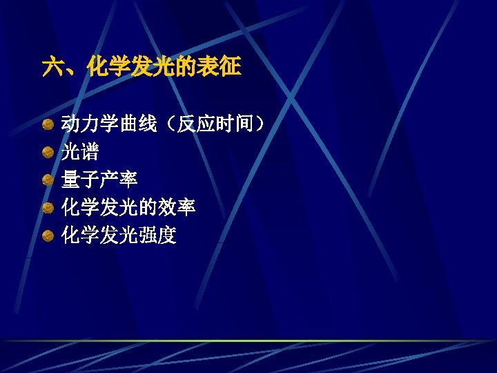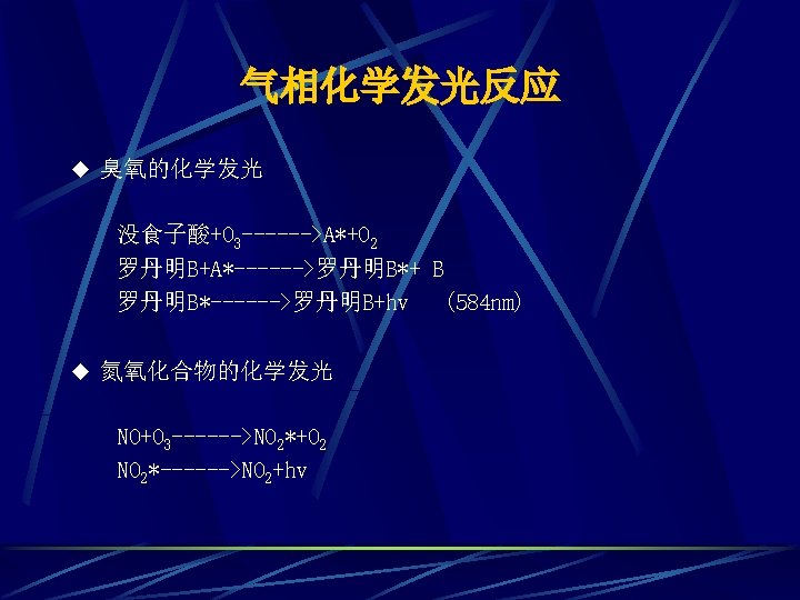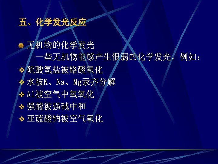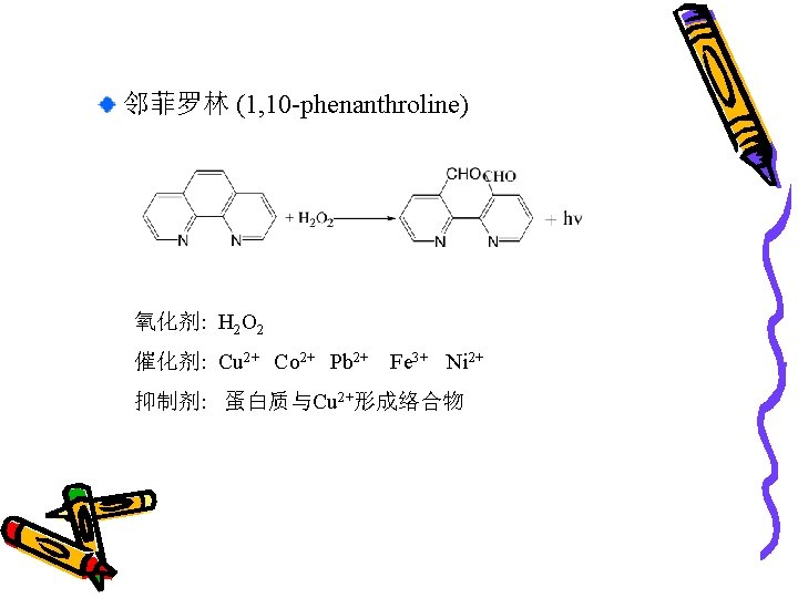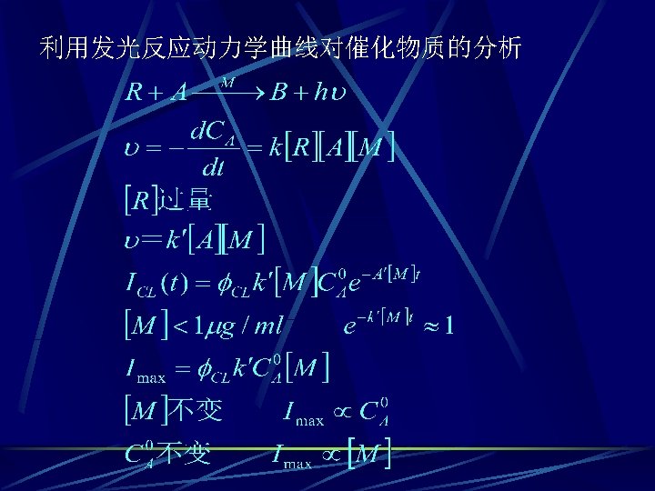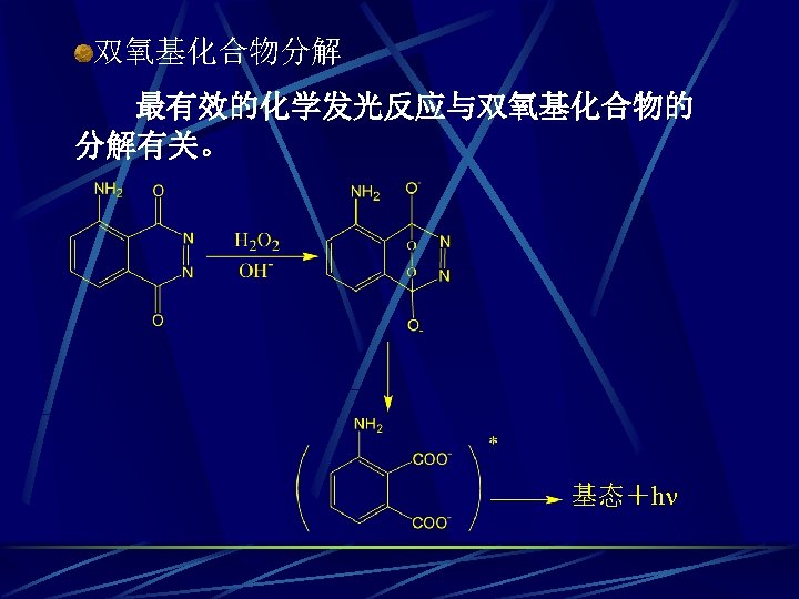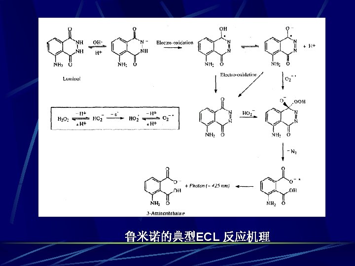 液相化学发光反应 鲁米诺 (luminol) OXIDANT * 3 -APA + BASE h luminol 3 -Aminophthalate max = 425 nm 氧化剂: H 2 O 2 KMn. O 4 Na. Cl. O I 2 [Fe(CN)6]3 -. 催化剂: 过氧化酶 氧化血红素 过渡金属离子(Co 2+、 Cu 2+、Fe 3+) 抑制剂