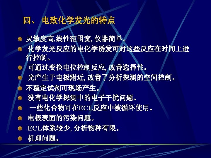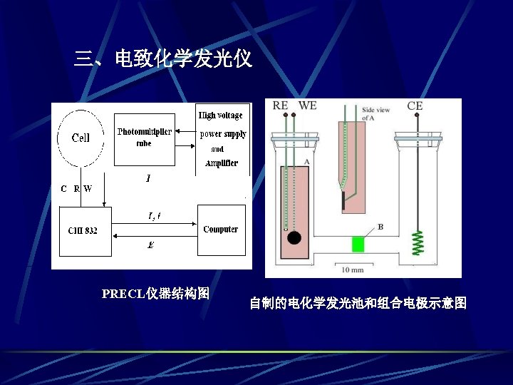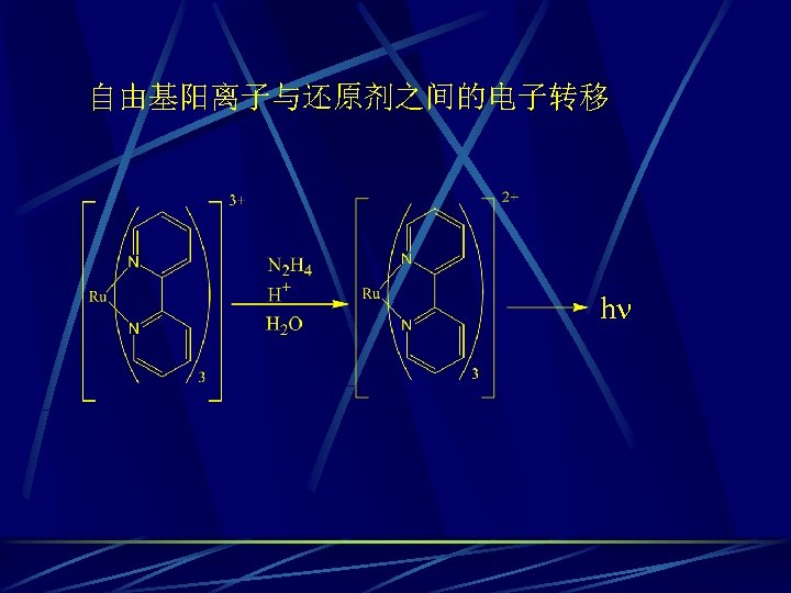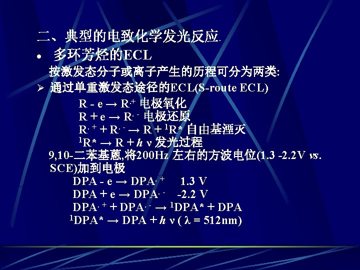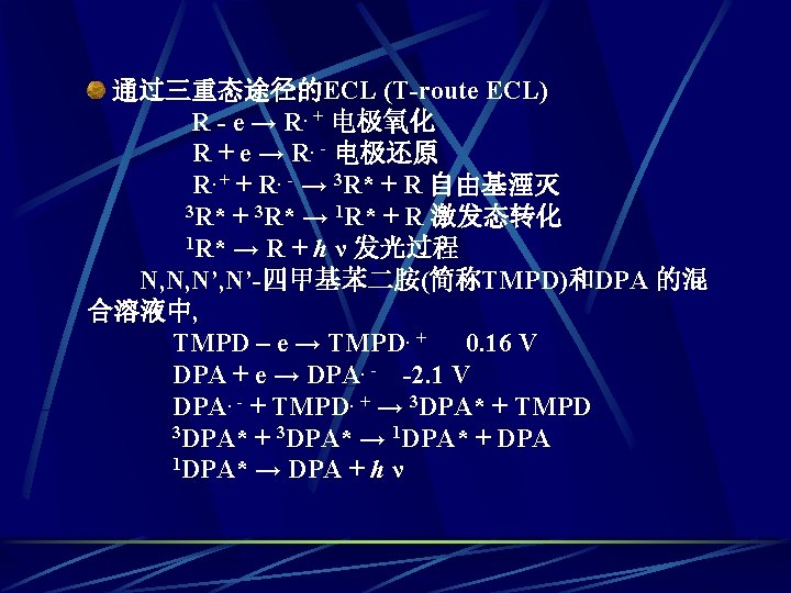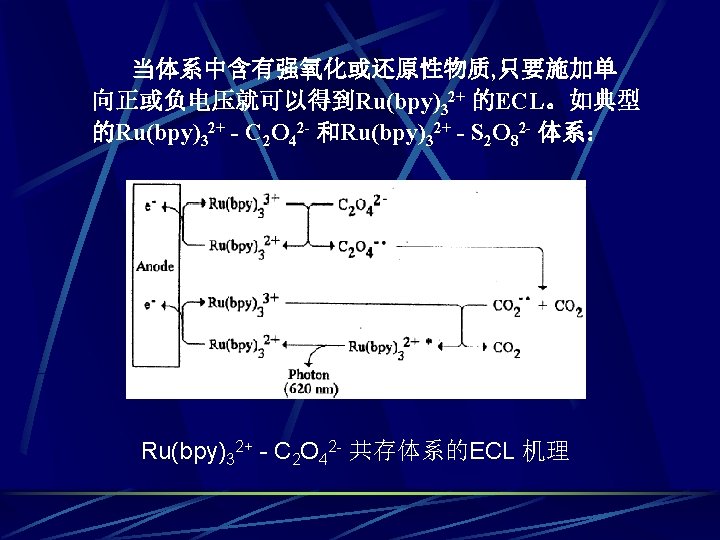 Ru(bpy)32+的ECL Ru(bpy)32+ + e → Ru(bpy)3+ Ru(bpy)3 2+ - e → Ru(bpy)33+ 电极还原 电极氧化 Ru(bpy)3+ + Ru(bpy)33+ → Ru(bpy)32++ Ru(bpy)32+* → Ru(bpy)32+ + h ( λ = 620 nm)