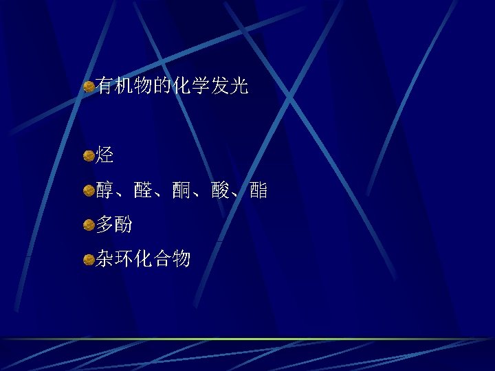 1, 2 -二氧杂环丁烷类 • Alkaline phosphatase (ALP) dephosphorylates AMPPD (1, 2 -二氧杂环丁烷类) to form a dioxetane anion, which fragments into adamantanone (金刚烷酮)and the excited state of methyl meta-oxybenzoate anion (间氧苯甲酸甲酯阴离子), the light emitter. • The detect limit of ALP is 10 -21 mol/L. • The derivatives of AMPPD are superior than the parent compound to the lighting rates and signal intensities.