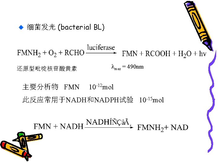 萤火虫发光 (firefly BL) max = 562 nm 此反应重要的分析对象是ATP 10 -11~10 -14 mol