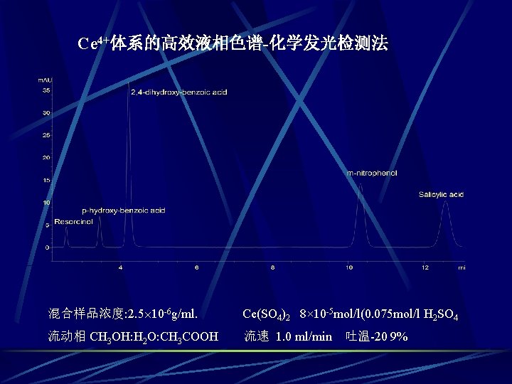 Application Table 3 The determination of salicylic acid (SA) in bactericidal solution(n 6) Sample SA found (10 -7 g/ml) RSD (%) This method Ref *1 1 2 3 0. 82 0. 79 1. 78 1. 80 2. 67 2. 64 SA added (10 -7 g/ml) SA recovery 1. 50 1. 56 103. 8 1. 50 100. 1 1. 52 100. 8 1. 1 1. 2 0. 6 *Ref: UV-Spectrophotometry (10 -7 g/ml) (%)
