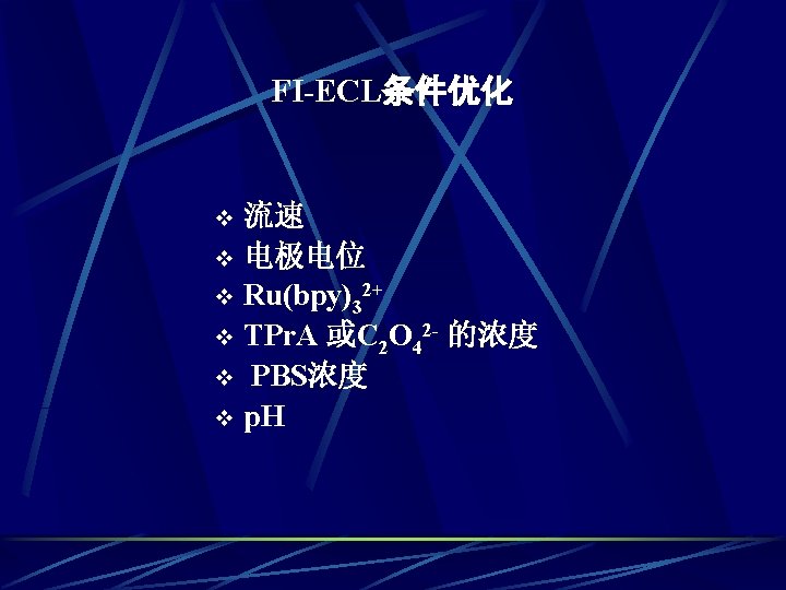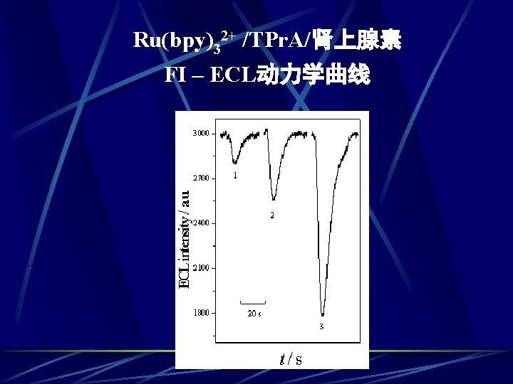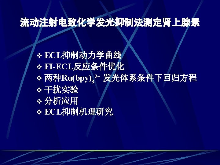 肾上腺素测定的回归方程 ECL system Ru(bpy)32+/TPr. A Linear range (mol/L) 2 10 -8 - 1 10 -4 Log( I)=5. 935+0. 587 log. C Correlation coefficient r=0. 995 - 5 10 -7 - 1 10 -5 Log( I)=2. 580+0. 133 log. C r=0. 991 Ru(bpy)32+/C 2 O 42 Regression equation