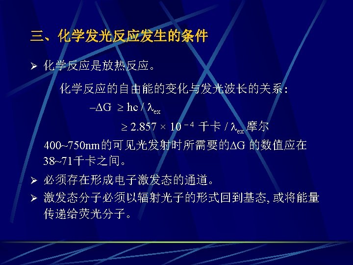 Ru(bpy)32+ - S 2 O 82 - 体系的发光反应机理: Ru(bpy)32+ + e → Ru(bpy)3+ S 2 O 82 - + e → SO 42 - + SO 4. - + Ru(bpy)3+ → Ru(bpy)32+* + SO 42 SO 4. - + Ru(bpy)32+ → Ru(bpy)33+ + SO 42 Ru(bpy)3+ + Ru(bpy)33+ → Ru(bpy)32+ + Ru(bpy)32+* → Ru(bpy)32+ + h
