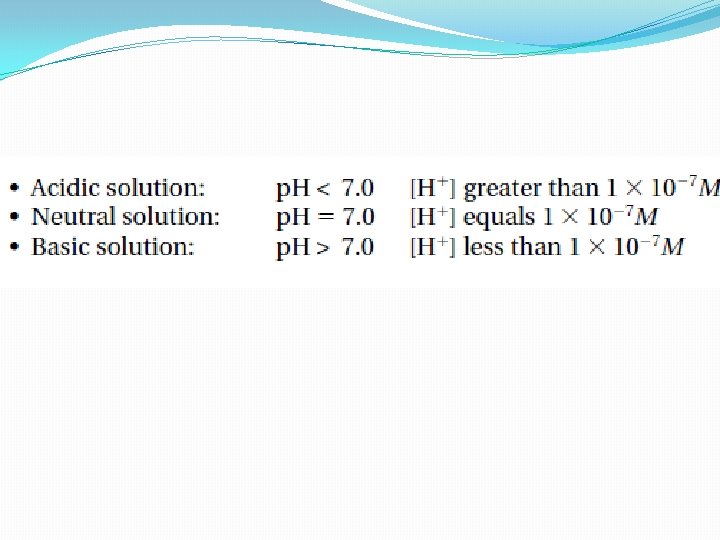 Acidic and Basic Solutions • A solution in which [H+] is greater than [OH−] is an acidic solution. The [H+] is greater than 1 × 10− 7 M. • A basic solution is one in which [H+] is less than [OH−]. The [H+] is less than 1 × 10− 7 M –Basic solutions are also known as alkaline solutions