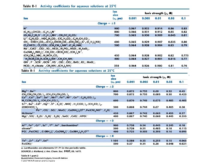 8 -2 Activity Coefficients • To account for the effect of ionic strength, concentrations in the calculation of equilibrium constant show be replaced by activities: ẲC = [C]*γC • The activity of species j is its concentration multiplied by its activity coefficient, ai = Ciƒi ƒi = activity coefficient. • At low ionic strength, activity coefficients approach unity.